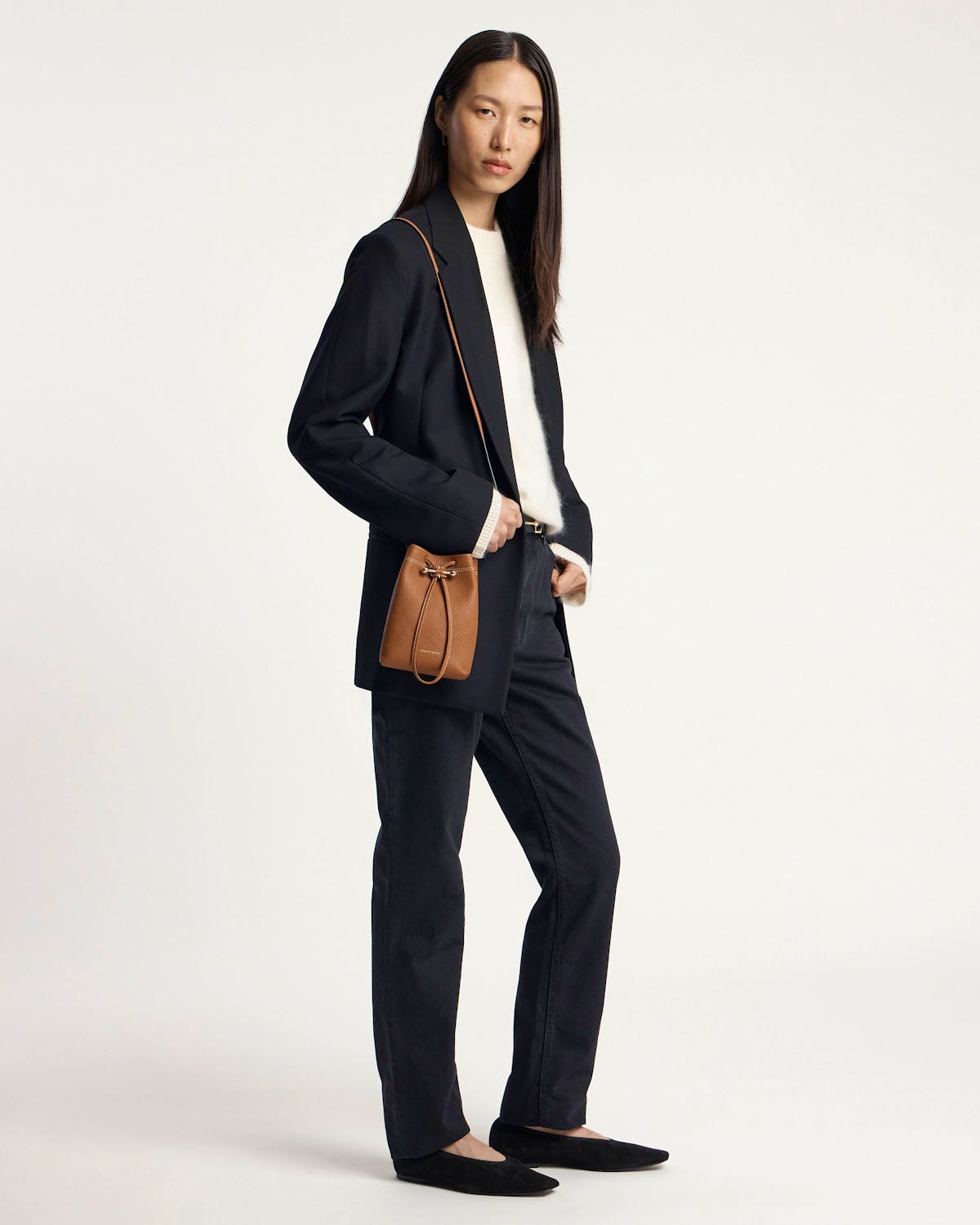 こちらのバッグの重量は 0.148kg (0.3lbs) 、着用中のモデルの背丈は 178cm (5'10") です。ストラップの長さは120cm (47.2") で。