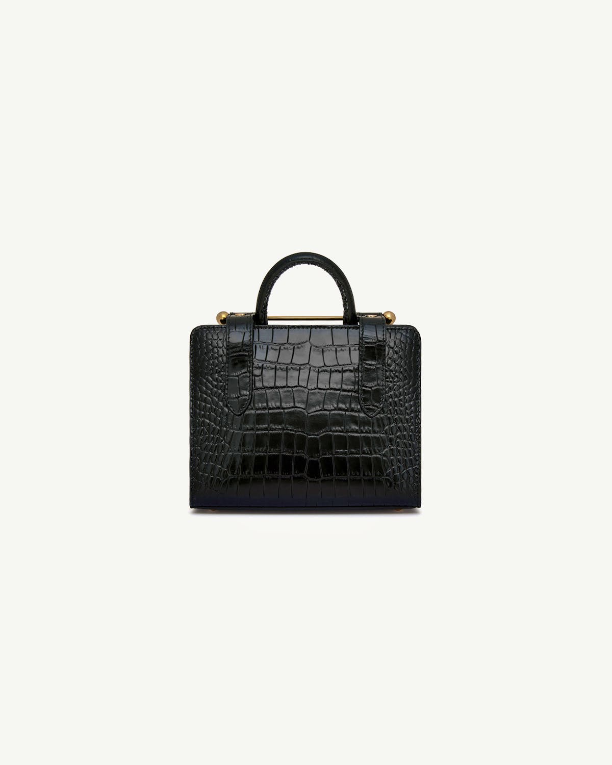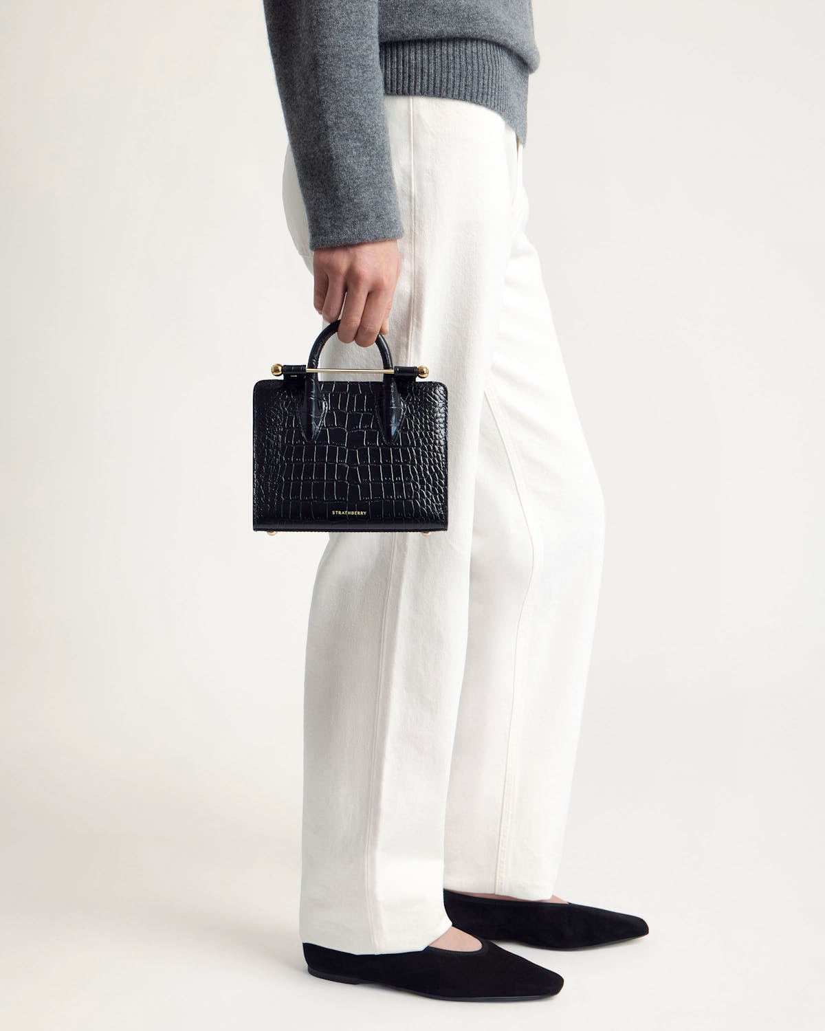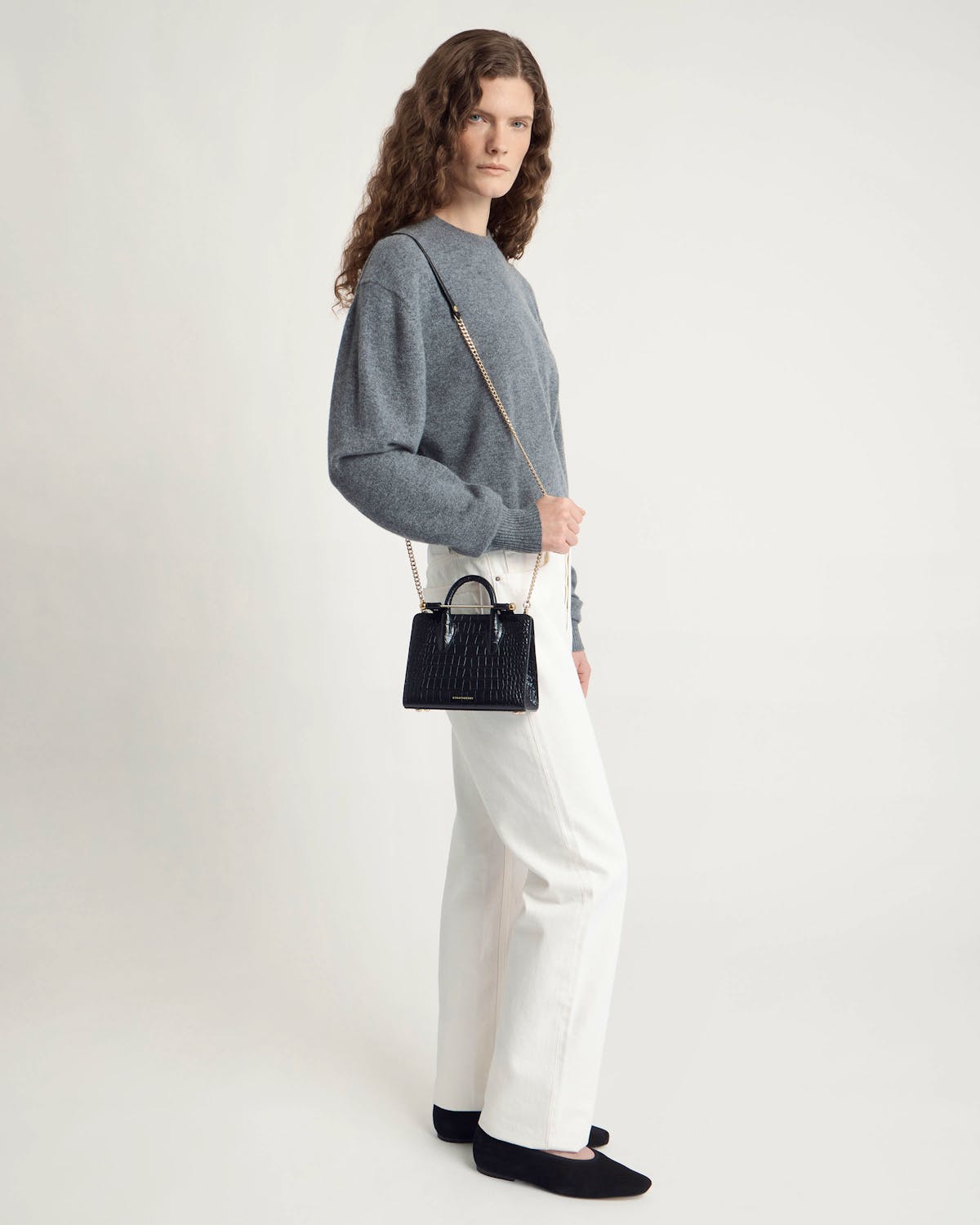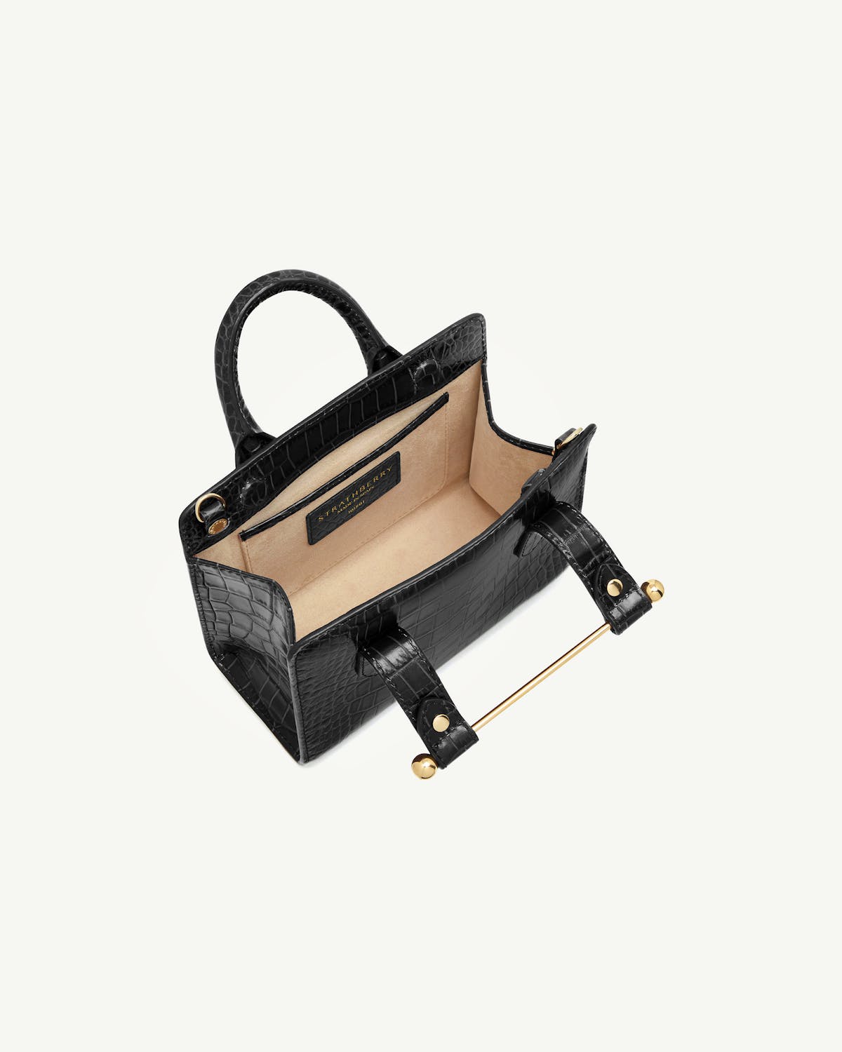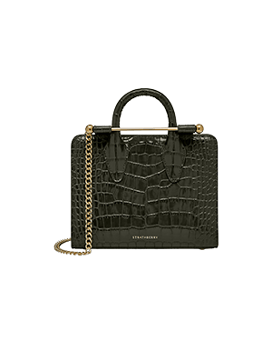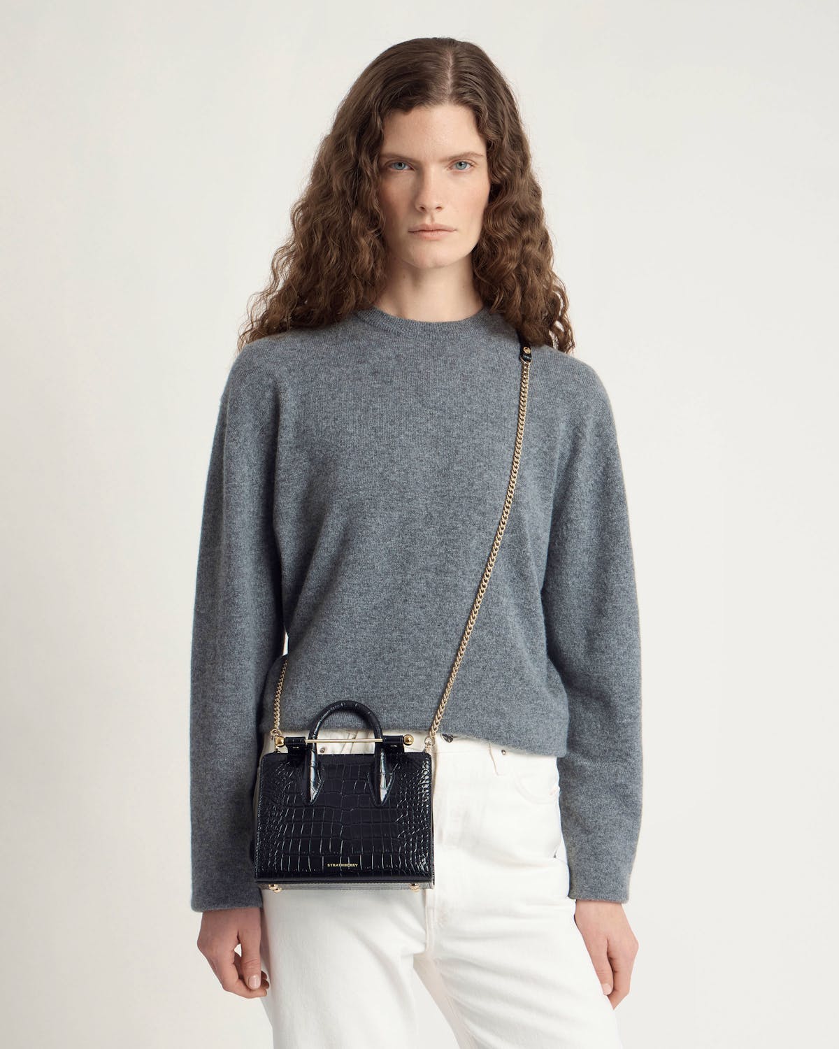 Nano Toteはすっきりとした飽きのこないスタイルとストラスベリー独自のバークロージャーが特徴です。内部は一つのコンパートメントで内ポケット付き。ストラスベリー独自の金具を使用、取り外し可能なストラップ付き。クロコダイルのエンボス加工を施したバニラ色の最高級カーフレザーを使用しスペインで手作り。